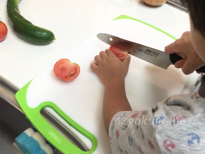 収穫したトマトときゅうりでサラダを作ろう☆親としても一人でスーパーで買ってきた野菜を一人で調理するより、楽しいです!