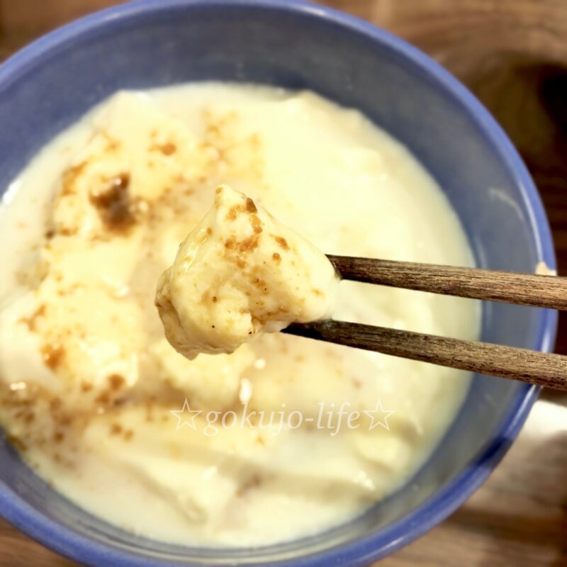 自家製胡麻だれとかつお節&生姜で食べた後、豆腐がとろけた豆乳のような汁も最後まで美味しく飲めます。